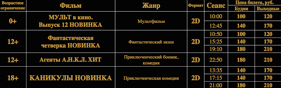 Если это расписание устарело, то новое можно посмотреть здесь: Афиша сеансов кинотеатра «Энергетик» г.Заволжье
